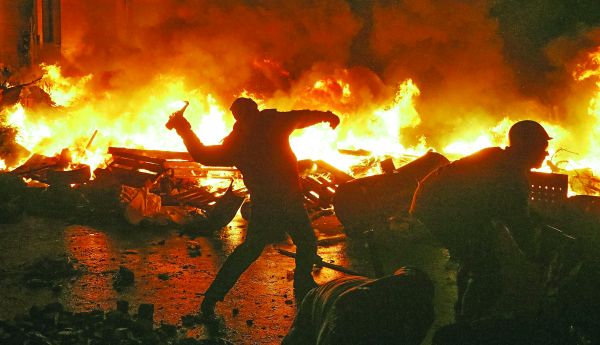 Η μυρωδιά των καμμένων λάστιχων, η εικόνα των λεηλατημένων κυβερνητικών κτιρίων, ο ήχος των πυροτεχνημάτων και το βαθύ κόκκινο του αίματος νεκρών και τραυματιών συστήνουν το νεοεμφυλιακό ουκρανικό τοπίο.