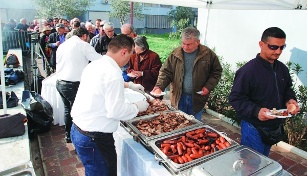Δέκα το πρωί στη Βαρβάκειο, μέσα από το… σύννεφο τσίκνας που (ήδη) σκεπάζει την πλατεία μπροστά στην Κεντρική Κρεαταγορά της Αθήνας, ξεπροβάλλει ένα ανθρώπινο «κορδόνι» 30 μέτρων με ηλικιωμένους, αστέγους, ανέργους αλλά και… επαγγελματίες τζαμπατζήδες! Οι ψησταριές έχουν πάρει φωτιά και η μυρωδιά από το χοιρινό, το κοτόπουλο, το αρνάκι και τα λουκάνικα που «ξαπλώνουν» στα κάρβουνα «παίζει» με την υπομονή των περίπου 400 ανθρώπων που στέκονται από τις 9.00 πίσω από τα προστατευτικά κιγκλιδώματα για λίγο δωρεάν κρέας, μια φέτα ψωμί και ένα ποτηράκι κρασί.