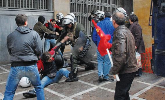 Ενώ όλα έδειχναν ότι δεν υπήρχαν παρατράγουδα, περίπου στις 14.00 εκατοντάδες διαδηλωτές από διάφορα σωματεία και συλλογικότητες συναντήθηκαν επί της οδού Σταδίου, στο ύψος της Παλαιάς Βουλής, και επιχείρησαν να πορευτούν προς το υπουργείο Οικονομικών. Βρέθηκαν ωστόσο αντιμέτωποι με διμοιρίες των ΜΑΤ που είχαν μπλοκάρει με κλούβες τη Σταδίου. Ακολούθησαν φραστικές αντιπαραθέσεις με τα ΜΑΤ και σε ανύποπτο χρόνο μια μεγάλη ομάδα διαδηλωτών κατάφερε να σπάσει τον αστυνομικό κλοιό και να κινηθεί ταχέως προς την πλατεία Συντάγματος. Σε εκείνο το σημείο δυνάμεις των ΜΑΤ και της ομάδας ΔΕΛΤΑ έκαναν εκτεταμένη χρήση χημικών και άρχισαν να καταδιώκουν με κλομπ τους συγκεντρωμένους.