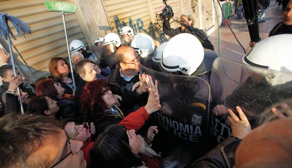 Σε κλοιό διαδηλωτών που «πολιόρκησαν» υπουργεία και άλλα δημόσια κτίρια τέθηκε για μια ακόμη φορά χθες το κέντρο της Αθήνας. Οι πιο έντονες στιγμές καταγράφηκαν έξω από το κτίριο του Γενικού Λογιστηρίου του Κράτους, όπου συγκεντρώθηκαν οι υπό απόλυση καθαρίστριες του υπουργείου Οικονομικών, υψώνοντας σκούπες, σφουγγαρίστρες και κουβάδες. Εχοντας στο πλευρό τους εργαζομένους του Γενικού Λογιστηρίου, οι καθαρίστριες απέκλεισαν από πολύ νωρίς το πρωί την είσοδο του κτιρίου και ήρθαν αντιμέτωπες με τις ασπίδες και τα γκλοπ των ΜΑΤ που τις απομάκρυναν βιαίως.