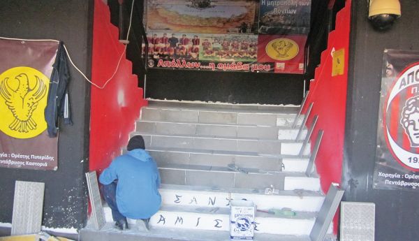 «Το φθινόπωρο σε ένα παιχνίδι του Απόλλωνα έπεσε η ιδέα! Μέσα σε μικρό χρονικό διάστημα μαζευτήκαμε 20 άτομα ξεκινώντας να βάφουμε κάγκελα, να κάνουμε διάφορες βελτιωτικές εργασίες στους πάγκους, στις θύρες του γηπέδου, στα δημοσιογραφικά, στους προβολείς» λέει στη «δ» ο πρόεδρος του ομίλου φίλων Απόλλωνα Πόντου (όπως ονόμασαν την ομάδα τους) Μιχάλης Φωτιάδης, ιδιοκτήτης σχολής οδηγών, ενώ ο Γρηγόρης Μακρίδης, πυροσβέστης, συμπληρώνει: «Τον χειμώνα σταματήσαμε λόγω του καιρού και τώρα ξεκινήσαμε να τοποθετούμε πλακάκια στη θύρα 3. Πρόκειται για μια ανιδιοτελή προσπάθεια, δεν ζητήσαμε χρήματα από πουθενά και όλα γίνονται με χρήματα των φίλων της ομάδας. Θέλουμε το κάθε ευρώ του καθενός. Το καλό είναι ότι ο κόσμος βλέπει αυτό που γίνεται και έχει αγκαλιάσει ακόμη περισσότερο την προσπάθεια».