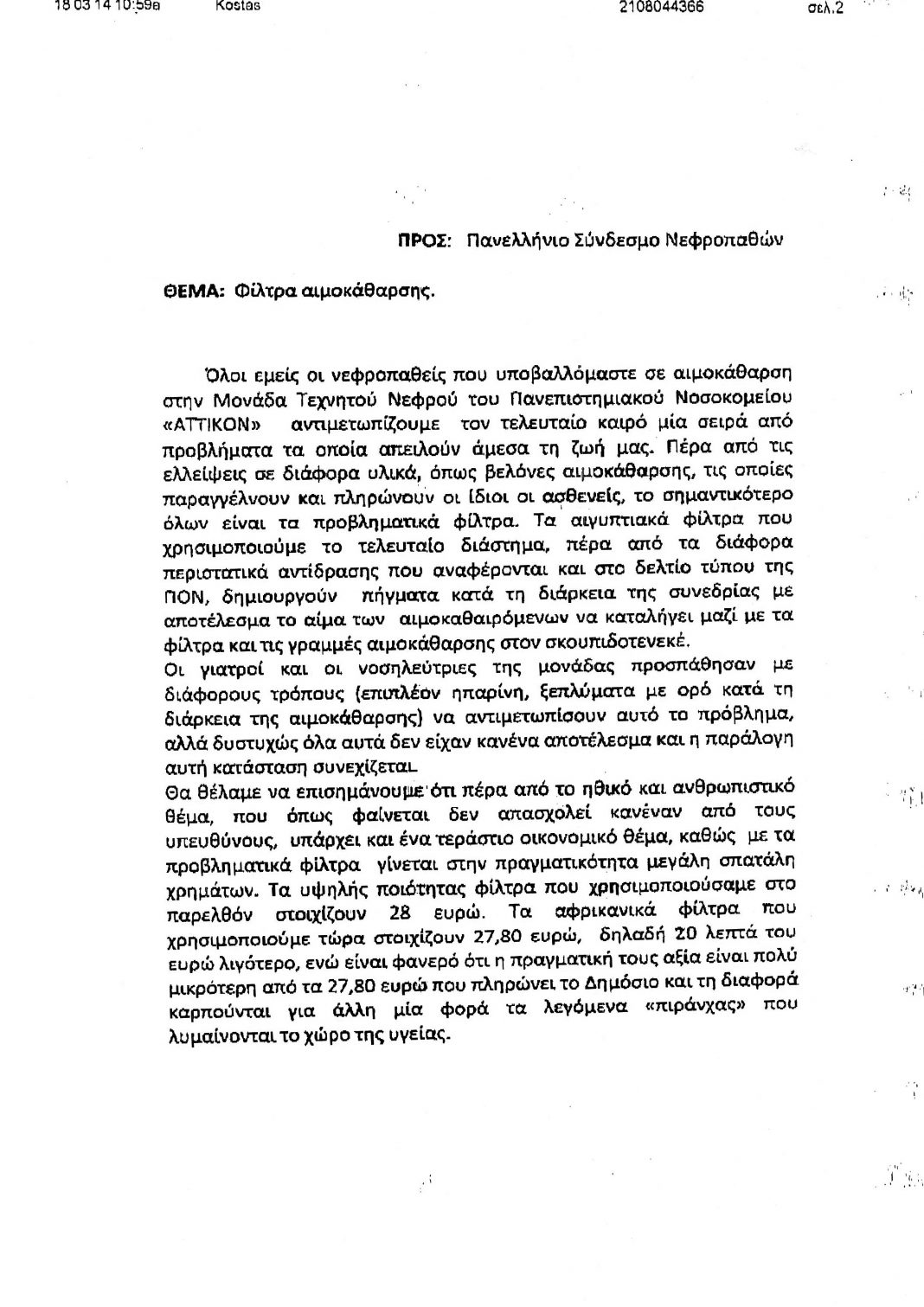 Σε άλλο σημείο τονίζει ότι «η επαρκής αιμοκάθαρση σχετίζεται άμεσα με τον χρόνο επιβίωσης των ουραιμικών. Οι ασθενείς θα αντιδράσουν δικαίως εάν για 0,5 ευρώ ανά φίλτρο υποχρεωθούν να υποβάλλονται σε ανεπαρκή αιμοκάθαρση»!