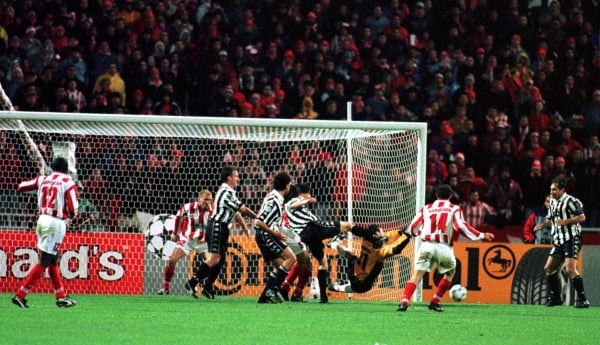 Με μια εκπληκτική πορεία, ο Ολυμπιακός εκείνη τη σεζόν θα προκριθεί ως πρώτος από τον όμιλό του, αφήνοντας εκτός την Πόρτο και τον Αγιαξ. Στους «8» βρήκε απέναντί του τη Γιουβέντους και ασφαλώς τα προγνωστικά δεν ήταν με το μέρος του. Η «γηραιά κυρία» πήρε προβάδισμα στο πρώτο ματς στο Ντέλε Αλπι του Τορίνου με 2-0, χάρη στα γκολ των Ιντζάγκι (37΄) και Κόντε (78΄), όμως το πέναλτι του Νινιάδη στο φινάλε (89΄) διατήρησε τις ελπίδες των «ερυθρολεύκων» ζωντανές. Στη ρεβάνς του ΟΑΚΑ η αγωνία ήταν μεγάλη και ο Ολυμπιακός έδωσε ακόμη μεγαλύτερες ελπίδες, αφού έφτασε πολύ γρήγορα στο χρυσό γκολ με την κεφαλιά του Σίνισα Γκόγκιτς (13΄). Η εικόνα, μάλιστα, δεν άλλαξε και οι «ερυθρόλευκοι» κρατούσαν την πρόκριση στα χέρια τους ως το 85′. Εκεί όπου μια λάθος εκτίμηση του Δημήτρη Ελευθερόπουλου με άστοχη έξοδο έδωσε τη σπάνια ευκαιρία στον σημερινό προπονητή των Ιταλών Αντόνιο Κόντε να στείλει τη Γιουβέντους στον ημιτελικό. Εκεί αποκλείστηκε από τη μετέπειτα πρωταθλήτρια Ευρώπης Μάντσεστερ Γιουνάιτεντ, στον συγκλονιστικό τελικό της Βαρκελόνης κόντρα στην Μπάγερν.