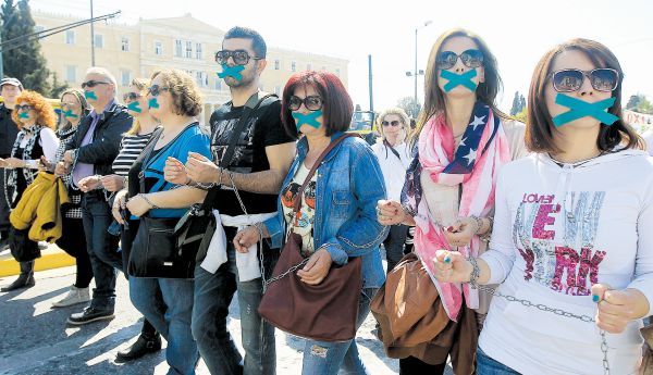 Αλυσοδέθηκαν έξω από τη Βουλή και «σφράγισαν» τα στόματά τους με κολλητική ταινία οι απλήρωτοι, εδώ και επτά μήνες, εργαζόμενοι του προγράμματος Βοήθεια στο Σπίτι που διαδήλωσαν χθες στο κέντρο της Αθήνας, με κύρια αιτήματα τη διασφάλιση της λειτουργίας του προγράμματος και την καταβολή των δεδουλευμένων τους. Μετά τη συμβολική διαμαρτυρία τους για το καθεστώς «ομηρίας» στο οποίο βρίσκονται, κατευθύνθηκαν στο υπουργείο Εργασίας και συναντήθηκαν με στελέχη του υπουργείου χωρίς, όμως, να λάβουν διαβεβαιώσεις για την ικανοποίηση των αιτημάτων τους.