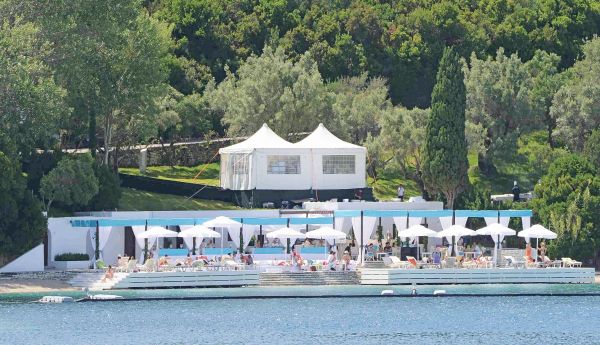 Το μεσημέρι όσοι βρίσκονταν στην παραλία (όπου κάποτε απολάμβαναν τον ήλιο και τη θάλασσα η Χριστίνα Ωνάση και η Τζάκι Κένεντι) παρακολούθησαν ακροβατικά σόου με τζετ σκι και άλλα εξτρίμ θαλάσσια σπορ, ενώ διοργανώθηκε και παιχνίδι του κρυμμένου θησαυρού, για το οποίο επιστρατεύτηκε ακόμη και… πειρατικό καράβι! Από το απόγευμα της Τρίτης στα γαλαζοπράσινα νερά του Ιονίου είχαν ρίξει άγκυρα η θαλαμηγός «Samadhi» με σημαία Κέιμαν, το πλωτό παλάτι «Domino», το οποίο είχε ξεκινήσει από τις Κάννες, καθώς και τo κρουαζιερόπλοιο «Seabourn spirit» με σημαία Μπαχάμας.