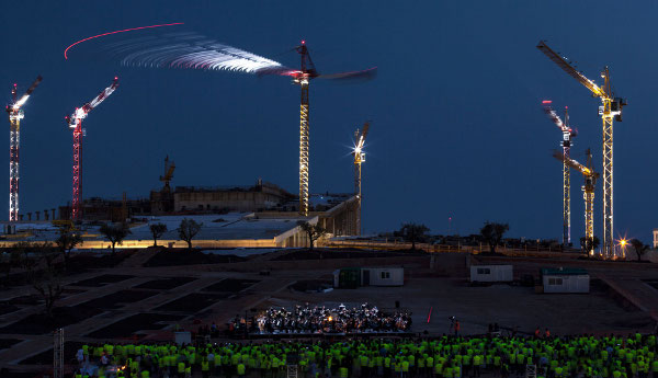 Φωτισμένοι οι διαφορετικοί αυτοί… σολίστ χορού καθήλωσαν με την εκφραστικότητά τους τούς δεκάδες παρευρισκόμενους, οι οποίοι παρακολούθησαν με κομμένη την ανάσα το πρωτότυπο αυτό δρώμενο, που έφερε τον τίτλο «Ο χορός των γερανών». Η παρουσία των θεατών στον χώρο μάλιστα έγινε με τον τρόπο που αρμόζει στους επισκέπτες κάθε εργοταξίου: φορώντας φωσφοριζέ γιλέκα εργασίας. Η παράσταση, διάρκειας δεκαπέντε λεπτών, άρχισε λίγο μετά τη δύση του ηλίου. Οι γερανοί, υπό τη συνοδεία των 98 μουσικών της Ορχήστρας της Εθνικής Λυρικής Σκηνής και του μαέστρου Μύρωνα Μιχαηλίδη, άρχισαν να κινούνται ρυθμικά. Ο χορός τους φιλοξενήθηκε πάνω από το πιο γνωστό σημείο του έργου, τον τεχνητό λόφο, ύψους 14 μέτρων, η κατασκευή του οποίου έχει ήδη ολοκληρωθεί.