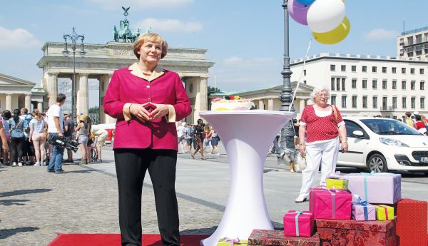 Η κέρινη εκδοχή της Ανγκελα στέκεται μπροστά από την Πύλη του Βραδεμβούργου στο Βερολίνο. Σαν να περιμένει να υποδεχτεί τους καλεσμένους της ή να ξεναγήσει τους ξένους της. Γιορτάζει εξάλλου σήμερα τα 60ά της γενέθλια. Με την αφορμή αυτής της επετείου το Μουσείο Μαντάμ Τισό τοποθέτησε στην καρδιά του Βερολίνου το κέρινο ομοίωμα της Γερμανίδας καγκελαρίου.