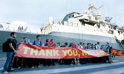 Aφησαν πίσω τους την κόλαση της Λιβύης και έπειτα από ένα δύσκολο ταξίδι διάρκειας 27 ωρών έφθασαν το πρωί του Σαββάτου στο λιμάνι του Πειραιά, όπου τους υποδέχθηκαν θερμά φίλοι, συγγενείς, πρέσβεις ξένων χωρών αλλά και δεκάδες… Κινέζοι. Οι 77 Ελληνες που επιβιβάστηκαν το απόγευμα της περασμένης Πέμπτης στην φρεγάτα «Σαλαμίς» του Πολεμικού Ναυτικού, μαζί με 12 Κύπριους, 78 Κινέζους, 10 Αγγλους, επτά Βέλγους, έναν Ρώσο και έναν Αλβανό, έζησαν συγκινητικές στιγμές βλέποντας δικούς τους ανθρώπους, αλλά και αγνώστους, να τους περιμένουν στο λιμάνι με δάκρυα χαράς στα μάτια και με μια… αγκαλιά λουλούδια.