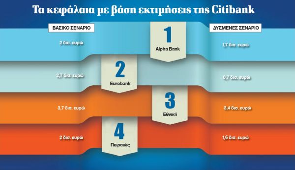 Αναλυτές της Citibank βλέπουν πλεόνασμα κεφαλαίων για τις ελληνικές τράπεζες τόσο με βάση το βασικό σενάριο όσο και με το δυσμενές και υποστηρίζουν ότι οι τράπεζες δεν θα χρειαστούν νέες αυξήσεις κεφαλαίου. Ο οίκος βέβαια διευκρινίζει ότι τα συμπεράσματα αυτά προκύπτουν κάνοντας μια ανανέωση των στοιχείων με βάση το μοντέλο που χρησιμοποίησε η ΤτΕ, το οποίο είναι πιθανό να διαφέρει από αυτό που θα χρησιμοποιήσει για τα stress tests η Ευρωπαϊκή Κεντρική Τράπεζα.