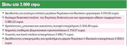 Στα υψηλά μισθολογικά κλιμάκια, με μέσες μεικτές αποδοχές που ξεκινούν από τα 2.000 ευρώ και φθάνουν τα 4.500 ευρώ (ή και παραπάνω), περιλαμβάνονται τα στελέχη των δημόσιων και των ιδιωτικών επιχειρήσεων, καθώς και της κρατικής μηχανής.