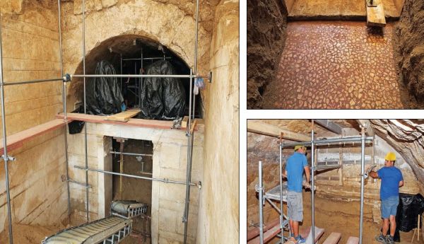 Με την αφαίρεση χωμάτων από τον προθάλαμο, όπως ενημερώνει το υπουργείο Πολιτισμού, «στον χώρο πίσω από τον τοίχο των σφιγγών αποκαλύφθηκε τμήμα μαρμαροθετημένου δαπέδου, με λευκά, μικρά ακανόνιστα τμήματα μαρμάρου, σε κόκκινο φόντο, σωζόμενο σε εξαιρετικά καλή κατάσταση. Στο κατώφλι του πρώτου διαφραγματικού τοίχου των σφιγγών εντοπίστηκαν επί της νωπογραφίας, η οποία το κάλυπτε, ίχνη μπλε χρώματος».