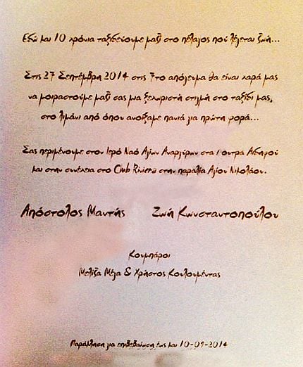 To προσκλητήριο του γάμου της με τον Απόστολο Μαντή