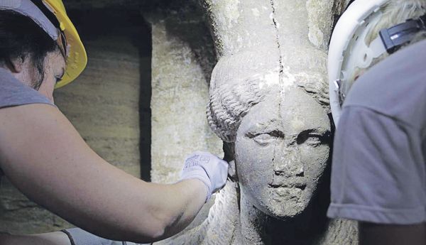 Τα δύο γυναικεία πρόσωπα βρέθηκαν το Σάββατο, τη στιγμή που οι αρχαιολόγοι αφαιρούσαν τα χώματα μπροστά από τον δεύτερο διαφραγματικό τοίχο στον μεσαίο θάλαμο του τάφου. Οι μορφές τους, κατασκευασμένες από θασίτικο μάρμαρο, αποκαλύφθηκαν κάτω από το μαρμάρινο επιστύλιο και οι διαστάσεις τους είναι 0,20Χ0,60 μέτρα.