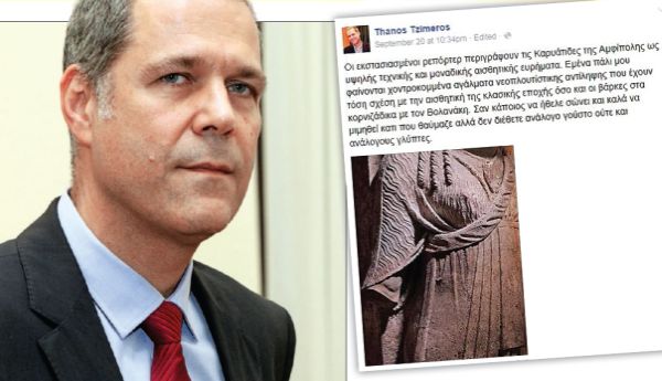 Δυστυχώς, για τον καλλιτέχνη που έφτιαξε τις Καρυάτιδες της Αμφιπόλεως ο Τζήμερος δεν τις γουστάρει όπως γούσταρε τη Μέρκελ. Εγραψε σχετικά στο facebook: «Οι εκστασιασμένοι ρεπόρτερ περιγράφουν τις Καρυάτιδες της Αμφίπολης ως υψηλής τεχνικής και μοναδικής αισθητικής ευρήματα. Εμένα πάλι μου φαίνονται χοντροκομμένα αγάλματα νεοπλουτίστικης αντίληψης που έχουν τόση σχέση με την αισθητική της κλασικής εποχής όσο και οι βάρκες στα κορνιζάδικα με τον Βολανάκη. Σαν κάποιος να ήθελε σώνει και καλά να μιμηθεί κάτι που θαύμαζε αλλά δεν διέθετε ανάλογο γούστο ούτε και ανάλογους γλύπτες». Ευτυχώς, ο άνθρωπος που δημιούργησε αυτά τα γλυπτά (μάλλον) δεν ζει ούτως ώστε να απογοητευτεί με την άποψη Τζήμερου.
