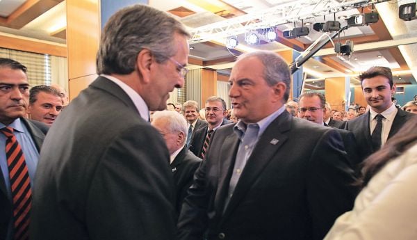 Με τον πρωθυπουργό είχε δύο θερμές χειραψίες: στην αρχή, όταν ο Αντώνης Σαμαράς μπήκε στην αίθουσα (αντάλλαξαν μια κουβέντα και ένα πλατύ χαμόγελο), και στο τέλος, όταν ο Καραμανλής σηκώθηκε για να αποχωρήσει. Μάλιστα, τον χαιρέτησε από μακριά «στρατιωτικά», και ο Σαμαράς τον κάλεσε κοντά του για να χαιρετηθούν.
