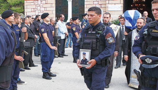 Με δάκρυα στα μάτια συγγενείς, φίλοι και συνάδελφοι αποχαιρέτησαν χθες στο κοιμητήριο της Καλλιθέας τον 33χρονο ειδικό φρουρό Δημήτρη Κατσιώνη, ο οποίος βρήκε φρικτό θάνατο, πάνω στο καθήκον, το βράδυ της Τρίτης στη λεωφόρο Κηφισού, όταν παρασύρθηκε από δύο οχήματα. Τραγικές φιγούρες η σύζυγός του Στέβη, με την οποία είχαν αποκτήσει ένα κοριτσάκι οκτώ μηνών, η χαροκαμένη μητέρα του Πόπη και τα τρία αδέλφια του. Αγημα της Αστυνομίας απέδωσε τιμές με τρεις ομοβροντίες, ενώ δεκάδες συνάδελφοί του από την ομάδα ΔΙΑΣ τον αποχαιρέτησαν μαρσάροντας και κορνάροντας με τις μοτοσικλέτες τους. Παρών στην κηδεία ήταν και ο υπουργός Δημόσιας Τάξης Βασίλης Κικίλιας.