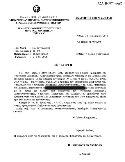 Αμέσως μετά τον σχηματισμό της τρικομματικής κυβέρνησης (Ν.Δ., ΠΑΣΟΚ, ΔΗΜ.ΑΡ.) τον Ιούνιο του 2012 και την τοποθέτηση του προσωπικού φίλου του πρωθυπουργού στη θέση του υφυπουργού Ανάπτυξης, ο εν λόγω υπάλληλος διατίθεται στο γραφείο του κ. Μηταράκη -αλήθεια, τι γυρεύει ένας υπάλληλος Υποχρεωτικής Εκπαίδευσης και μάλιστα επιμελητής στο γραφείο ενός κυβερνητικού στελέχους που υποτίθεται ότι ασχολείται με την ανάπτυξη;