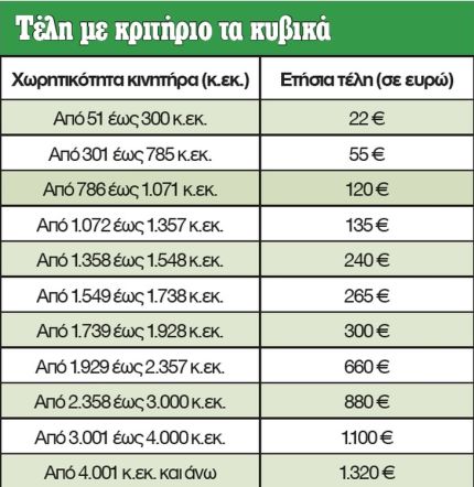 Διαθέσιμα στο σύστημα TAXISnet θα είναι από το Σάββατο 1η Νοεμβρίου τα έντυπα των τελών κυκλοφορίας του 2015, τα οποία οι ιδιοκτήτες Ι.Χ. θα πρέπει να πληρώσουν έως τις 31 Δεκεμβρίου 2014. Η Ελλάδα είναι ίσως η μόνη χώρα στον κόσμο που εφαρμόζει διαφορετικά κριτήρια και επιβάλλει διαφορετικά τέλη για το ίδιο αυτοκίνητο. Οσα αυτοκίνητα ταξινομήθηκαν έως και τις 31 Οκτωβρίου 2010 χρεώνονται με βάση τα κυβικά εκατοστά και το κόστος είναι από 22 ευρώ έως 1.320 ευρώ, ενώ όσα ταξινομήθηκαν μία μέρα αργότερα από την 1η Νοεμβρίου 2010 έως και σήμερα χρεώνονται με βάση τους ρύπους (έως 100 ρύπους υπάρχει απαλλαγή από τα τέλη κυκλοφορίας).