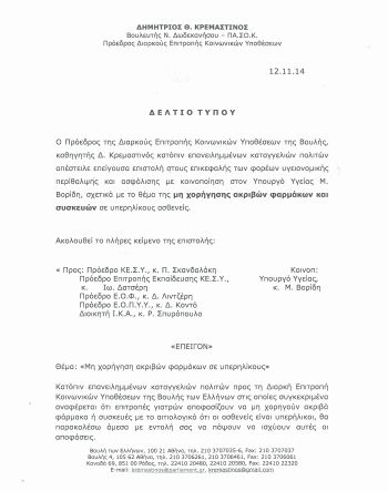 Μάλιστα, ο κ. Κρεμαστινός, σε δηλώσεις του, επισημαίνει ότι είναι αποφασισμένος να ζητήσει ακόμη και την παρέμβαση του εισαγγελέα, καθώς «η στέρηση του δικαιώματος στη ζωή αντίκειται όχι μόνο στους ιπποκρατικούς και θρησκευτικούς νόμους, αλλά αποτελεί ευθέως ποινικό αδίκημα γι’ αυτόν που το διαπράττει». Συγκεκριμένα, στις 12 Νοεμβρίου ο πρώην υπουργός Υγείας απέστειλε έγγραφο στον πρόεδρο του Κεντρικού Συμβουλίου Υγείας (ΚΕΣΥ) Παναγιώτη Σκανδαλάκη, στον πρόεδρο της Επιτροπής Εκπαίδευσης ΚΕΣΥ Ιωάννη Δατσέρη, στον πρόεδρο του ΕΟΦ Δημήτρη Λιντζέρη, στον πρόεδρο του ΕΟΠΥΥ Δημήτρη Κοντό και στον διοικητή του ΙΚΑ Ροβέρτο Σπυρόπουλο.