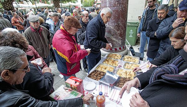 Ούτε ο βροχερός και κρύος καιρός δεν στάθηκε εμπόδιο στα «περήφανα γηρατειά» της Θεσσαλονίκης, καθώς χθες το πρωί συνταξιούχοι πραγματοποίησαν παράσταση διαμαρτυρίας έξω από το ΙΚΑ στην πλατεία Αριστοτέλους. Παρά τις οικονομικές δυσκολίες που αντιμετωπίζουν οι συνταξιούχοι, κερνούσαν τυροπιτάκια, γλυκά και κρασί στους περαστικούς, ευχόμενοι καλές γιορτές και καλά Χριστούγεννα.