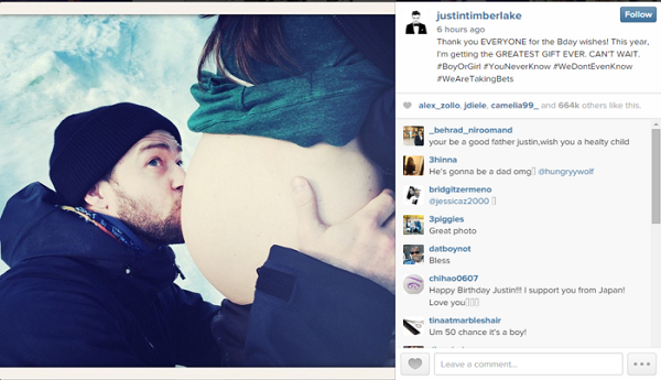 “Σας ευχαριστώ όλους για τις ευχές σας για τα γενέθλιά μου. Φέτος μου έκαναν το καλύτερο δώρο που έλαβα ποτέ. Δεν μπορώ να περιμένω” έγραψε ο 34χρονος Τίμπερλεϊκ στον λογαριασμό του στο Instagram. Ανάρτησε επίσης μια φωτογραφία που τον δείχνει, στα χιόνια, να αγκαλιάζει τη φουσκωμένη κοιλιά της 32χρονης Μπίελ με την οποία παντρεύτηκαν το 2012.