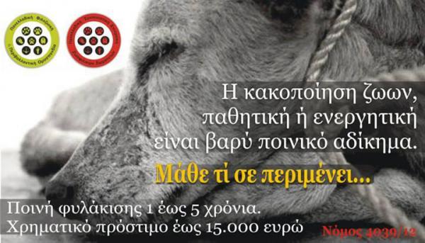 Ο βασανισμός, η κακοποίηση, η κακή και βάναυση μεταχείριση οποιουδήποτε ζώου, καθώς και η οποιαδήποτε πράξη βίας σε βάρος του, όπως η δηλητηρίαση, το κρέμασμα, ο πνιγμός, το κάψιμο, η σύνθλιψη, ο ακρωτηριασμός, αλλά και η αναίτια θανάτωσή του, είναι πράξεις που διώκονται σε βαθμό πλημμελήματος και τιμωρούνται με φυλάκιση ή χρηματική ποινή, ή και με τις δύο ποινές.