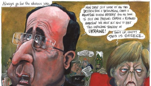 O Guardian με ένα καυστικό σκίτσο συγκρίνει την Ελλάδα με την Ουκρανία ή αφήνει να εννοηθεί πώς η Ελλάδα μπορεί να γίνει Ουκρανία αν η κυβέρνηση επιμείνει στη ρήξη με τους δανειστές. Ο Μάρτιν Ρόουσον στο τελευταίο του σκίτσο «φιλοξενεί» τον Φρανσουά Ολάντ και την Ανγκελα Μέρκελ. «Θεέ μου! Δες όλη αυτή την καταστροφή, την απόγνωση, το χάος και την αυξανόμενη ανθρώπινη δυστυχία. Και όλα αυτά εξαιτίας του καπρίτσιου και της αδίστακτης φιλοδοξίας ενός ανθρώπου», λέει ο Γάλλος πρόεδρος. «Πρέπει να δράσουμε ώστε να σταματήσουμε αυτή την εξελισσόμενη τραγωδία στην Ουκρανία», καταλήγει. Ακολουθεί όμως η αποστομωτική απάντηση της Μέρκελ. «Σκάσε ηλίθιε, είναι η Ελλάδα», του απαντά η Καγκελάριος στη φαντασία του σκιτσογράφου.