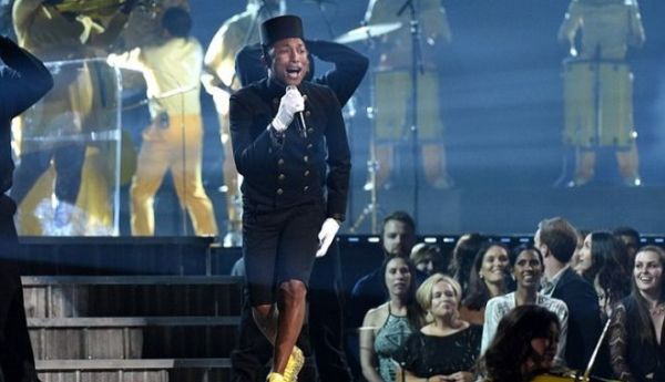 Έχοντας αποσπάσει τρία Grammy κατά τη χθεσινή τελετή, o Pharrell εμφανίσθηκε με κοστούμι γκρουμ ξενοδοχείου τιμώντας την ταινία Grand Budapest Hotel, για να ερμηνεύσει μαζί με χορωδία γκόσπελ το “Happy”.