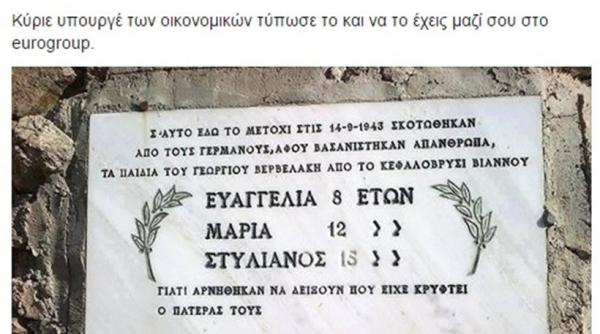 «Σ’αυτό εδώ το μετόχι στις 14-9-1943 σκοτώθηκαν από τους Γερμανούς, αφού βασανίστηκαν απάνθρωπα, τα παιδιά του Γεωργίου Βερβελάκη από το Κεφαλοβρύσι Βιάννου, Ευαγγελία 8 ετών, Μαρία 12 ετών, Στυλιανός 13 ετών, γιατί αρνήθηκαν να δείξουν πού είχε κρυφτεί ο πατέρας τους», αναγράφεται στην επιτύμβια πλάκα με τη βουλευτή του ΣΥΡΙΖΑ, απευθυνόμενη στον κ. Βαρουφάκη, να αναφέρει: «Κύριε υπουργέ των Οικονομικών τύπωσέ το και να το έχεις μαζί σου στο Eurogroup».