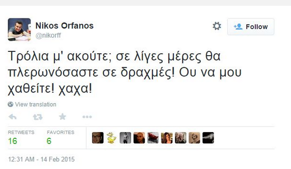 Ο Νίκος Ορφανός απευθύνθηκε στα «troll» του Twitter, λέγοντας πως «σε λίγες μέρες» θα… πληρώνονται σε δραχμές!