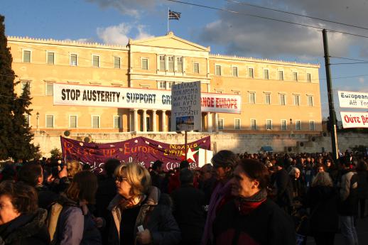 Τα περισσότερα πανό που έχουν αναρτηθεί είναι υπέρ της αλλαγής των πολιτικών στην Ευρώπη και κατά της λιτότητας, ενώ υπάρχουν και σατυρικά πανό, επηρεασμένα από το πνεύμα των αποκριάτικων ημερών.