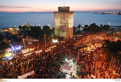 Με σύμμαχο τον καλό καιρό, πλήθος κόσμου πραγματοποιεί αυτήν την ώρα συγκέντρωση στον Λευκό Πύργο, με αίτημα “την έξοδο από τη λιτότητα και τα μνημόνια”, και με στόχο την έκφραση αλληλεγγύης στις ελληνικές θέσεις, στο πλαίσιο του αυριανού κρίσιμου Eurogroup.