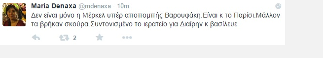 Σήμερα το μεσημέρι, δε, η δημοσιογράφος Μαρία Δεναξά έγραψε επί λέξει στο Twitter: «Δεν είναι μόνο η Μέρκελ υπέρ αποπομπής Βαρουφάκη. Είναι κ το Παρίσι. Μάλλον τα βρήκαν σκούρα. Συντονισμένο το ιερατείο για Διαίρην κ βασίλευε».