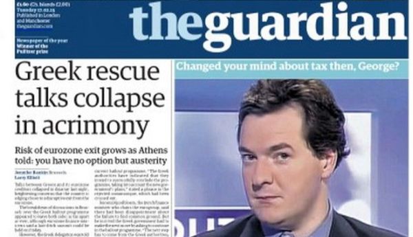 Η συζήτηση για τη διάσωση της Ελλάδας καταρρέει σε πικρία. Υπάρχει κίνδυνος εξόδου καθώς αυτό που λέγεται στην Αθήνα είναι: “Δεν έχετε καμιά άλλη επιλογή εκτός από τη λιτότητα”. Το κεντρικό άρθρο της βρετανικής εφημερίδας σημειώνει το τελεσίγραφο της Ευρώπης, το οποίο δεν μπορεί να δεχτεί η Ελλάδα. Ο Γιάνης Βαρουφάκης εξήγησε, σύμφωνα με την ελληνική πλευρά δεν μπορεί να γίνει δεκτή μια συμφωνία όπου δεν θα μπει νερό στη λιτότητα.