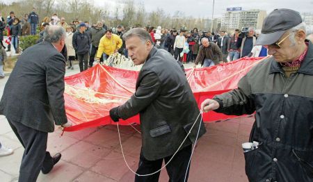 Στη φωτό Νο 2 βλέπουμε τον ισόβιο νομάρχη Θεσσαλονίκης (της καρδιάς μας) Παναγιώτη Ψωμιάδη να προσπαθεί (μαζί με άλλους καρντάσηδες) να σηκώσει έναν τεράστιο αετό. Το ημερολόγιο έδειχνε 6 Μαρτίου 2006.
