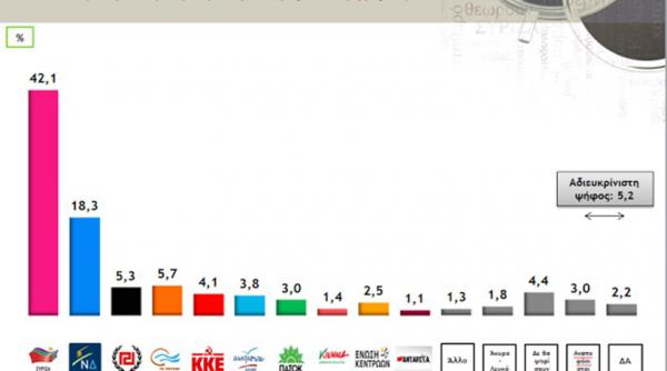 Το κυβερνών κόμμα συγκεντρώνει ποσοστό 42,1% έναντι 18,3% της Νέας Δημοκρατίας. Τρίτο κόμμα αναδεικνύεται το Ποτάμι με 5,7% και ακολουθούν Χρυσή Αυγή με 5,3%, ΚΚΕ με 4,1%, Ανεξάρτητοι Έλληνες με 3,8%, ΠΑΣΟΚ με 3%, Ένωση Κεντρώων με 2,5% και Κίνημα Δημοκρατών Σοσιαλιστών 1,4%.