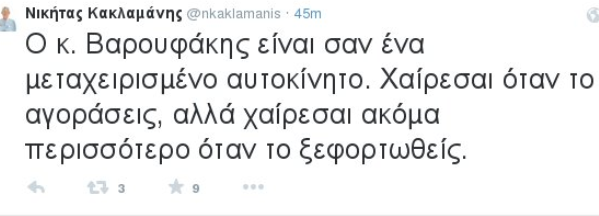 «Ο κ. Βαρουφάκης είναι σαν ένα μεταχειρισμένο αυτοκίνητο», έγραψε ο κ. Κακλαμάνης στο λογαριασμό του στο Twitter. «Χαίρεσαι όταν το αγοράσεις, αλλά χαίρεσαι ακόμα περισσότερο όταν το ξεφορτωθείς», πρόσθεσε, αναφερόμενος πάντα στον υπουργό Οικονομικών.