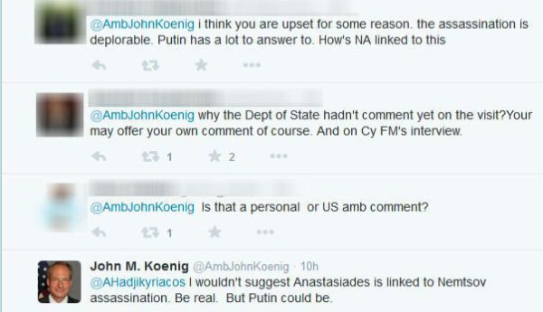 Ο διπλωμάτης καριέρας, ανήρτησε στον προσωπικό του λογαριασμό στο twitter ένα περίεργο – αν μη τι άλλο – ερώτημα: «Τι πιστεύουν οι άνθρωποι στην Κύπρο για την εβδομάδα στη Ρωσία, όπως φαίνεται από εδώ; Την επίσκεψη Αναστασιάδη και τις δηλώσεις του (σ.σ. στη Μόσχα) και την δολοφονία του Νεμτσόφ;». Αμέσως δέχθηκε πυρά από χρήστες του μέσου κοινωνικής δικτύωσης αλλά και διευκρινιστικές ερωτήσεις. Οι περισσότεροι ζητούσαν εξηγήσεις για την διασύνδεση της επίσκεψης του κύπριου προέδρου στη Μόσχα και της δολοφονίας του Ρώσου φιλοδυτικού. Σε κάποιον εκ των διαλόγων, ο αμερικανός πρέσβης απάντησε: «Δεν θα έλεγα ότι ο Αναστασιάδης έχει σχέση με την δολοφονία Νεμτσόφ. Αλλά ο Πούτιν, μπορεί».