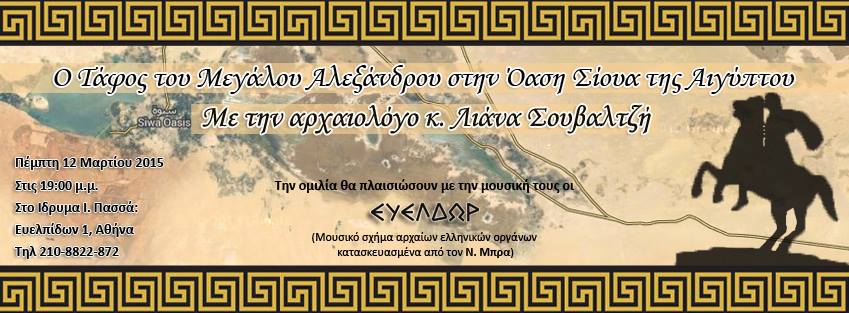 Σύμφωνα με την ανακοίνωση του Ιδρύματος Ι. Πασσά «Στην πανέμορφη όαση του Άμμωνος Διός και του Αλεξάνδρου, το 331 π.Χ. επέλεξε ο Αλέξανδρος των Ελλήνων και ο Φαραώ Αλέξανδρος για τους Αιγυπτίους, με την βοήθεια των ιερέων, τον “Τόπο” που θα κτιζόταν το λαμπρό του Μνημείο που θα αποτελούσε την τελευταία του κατοικία, όταν θα επέστρεφε και πάλι στην όαση, σύμφωνα με την θέληση του Θεού. Η ανακάλυψη του χαμένου Τάφου του Μ. Αλεξάνδρου από την αρχαιολόγο κ. Λιάνα Σουβαλτζή και τα μυστικά του Τάφου του, θα έχετε την ευκαιρία να τα ακούσετε από την ίδια την ανασκαφέα στις 12 Μαρτίου 2015, ημέρα Πέμπτη και ώρα 19:00 μ.μ. στην Αθήνα, στο ίδρυμα Ι. Πασσά, στην οδό Ευελπίδων αριθμός 1. Θα προβληθεί οπτικό υλικό.Την ομιλία θα πλαισιώσουν με την μουσική τους οι ΕΥΕΛΔΩΡ. Μουσικό σχήμα αρχαίων ελληνικών οργάνων κατασκευασμένα από τον Ν Μπρα. Πέμπτη 12 Μαρτίου 2015 Στις 19:00 μ.μ Στο Ιδρυμα Ι Πασσά Ευελπίδων 1 Αθήνα Τηλ 210-8822872. Είσοδος δωρεάν».