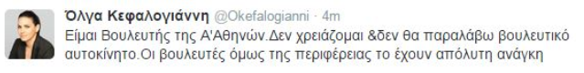 “Είμαι βουλευτής της Α’ Αθηνών. Δεν χρειάζομαι και δεν θα παραλάβω βουλευτικό αυτοκίνητο. Οι βουλευτές όμως της περιφέρειας το έχουν απόλυτη ανάγκη” έγραψε χαρακτηριστικά η βουλευτής της ΝΔ.