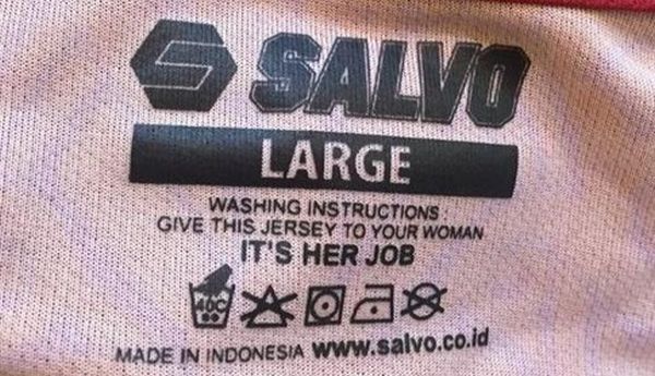 Συγκεκριμένα, πάνω στην ετικέτα με τις οδηγίες πλυσίματος αναγράφεται ρητά «Δώστε τη φανέλα στην γυναίκα σας. Είναι δική της δουλειά». Το όλο θέμα προέκυψε όταν ένας ποδοσφαιριστής της ομάδας Pusamania Borneo ανέβασε μια φωτογραφία με την ετικέτα στο Διαδίκτυο -μάλιστα, δεν του έκανε εντύπωση ο σεξισμός του όλου μηνύματος, αλλά απλώς το βρήκε… αστείο. Η εταιρία με τη σειρά της, σε μια απόπειρα να απολογηθεί, τα έκανε ακόμη χειρότερα: «Το μήνυμα μας είναι απλό. Για να μην πλύνετε την φανέλα σας με λάθος τρόπο, θα ήταν καλύτερα να τη δώσετε στη γυναίκα σας που είναι πιο ικανή σε αυτό. Δεν είχαμε πρόθεση να προσβάλουμε τις γυναίκες. Αντιθέτως, θέλαμε να στείλουμε ένα μήνυμα στους άνδρες, για να μάθουν από αυτές σχετικά με τη φροντίδα των ρούχων, επειδή αυτές δίνουν σημασία στη λεπτομέρεια». Κι όλα αυτά συνέβησαν στην Ινδονησία, όλως τυχαίως, λίγες ημέρες μετά την Παγκόσμια Ημέρα της Γυναίκας…
