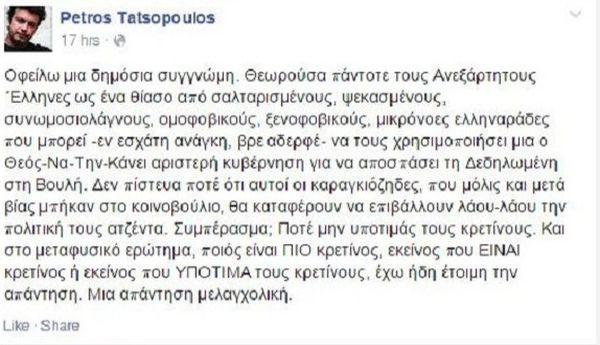 «Ο Θεός να την κάνει αριστερή κυβέρνηση», γράφει ο συγγραφέας και χαρακτηρίζει μεταξύ άλλων τους ΑΝΕΛ ψεκασμένους, ομοφοβικούς, καραγκιόζηδες και μικρόνοες ελληναράδες. «Οφείλω μια δημόσια συγγνώμη. Θεωρούσα πάντοτε τους Ανεξάρτητους ΄Ελληνες ως ένα θίασο από σαλταρισμένους, ψεκασμένους, συνωμοσιολάγνους, ομοφοβικούς, ξενοφοβικούς, μικρόνοες ελληναράδες που μπορεί -εν εσχάτη ανάγκη, βρε αδερφέ- να τους χρησιμοποιήσει μια ο Θεός-Να-Την-Κάνει αριστερή κυβέρνηση για να αποσπάσει τη Δεδηλωμένη στη Βουλή. Δεν πίστευα ποτέ ότι αυτοί οι καραγκιόζηδες, που μόλις και μετά βίας μπήκαν στο κοινοβούλιο, θα καταφέρουν να επιβάλλουν λάου-λάου την πολιτική τους ατζέντα. Συμπέρασμα; Ποτέ μην υποτιμάς τους κρετίνους. Και στο μεταφυσικό ερώτημα, ποιός είναι ΠΙΟ κρετίνος, εκείνος που ΕΙΝΑΙ κρετίνος ή εκείνος που ΥΠΟΤΙΜΑ τους κρετίνους, έχω ήδη έτοιμη την απάντηση. Μια απάντηση μελαγχολική», ανέφερε στην ανάρτηση του ο Πέτρος Τατσόπουλος.