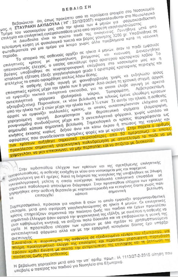 Το παιδί δεν επικοινωνεί με το περιβάλλον, είναι καθηλωμένο και σιτίζεται πολύ δύσκολα εξαιτίας των επιληπτικών κρίσεων που έχει, όπως αναφέρουν οι γιατροί της στο παιδιατρικό νοσοκομείο. Ειδικότερα, στις 3 Μαρτίου το Παίδων «Αγλαΐα Κυριακού» χορήγησε στον κ. Σταυράκη τη βεβαίωση που συνιστά «την παραπομπή του παιδιού σε εξειδικευμένο κέντρο του εξωτερικού για πλήρη προεγχειρητικό έλεγχο της επιληψίας και περαιτέρω χειρουργική παρέμβαση, εφόσον κριθεί δυνατή».