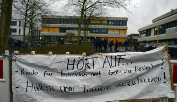 “Σταματήστε να προτείνετε χρήματα σε παιδιά για να πάρετε συνέντευξη” με αυτό το πανό κάνουν τη δική τους καταγγελία οι μαθητές και οι καθηγητές του γερμανικού σχολείου ενάντια στους δημοσιογράφους που προκειμένου να έχουν ένα θέμα, δεν διστάζουν να χρηματίσουν μικρά παιδιά για να τους δώσουν δηλώσεις.