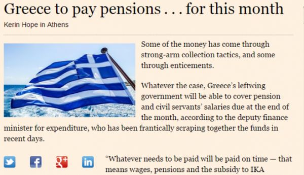 «Κάποια από τα χρήματα προέρχονται από αυστηρές τακτικές συλλογής χρημάτων και κάποια από την παροχή κινήτρων. Σε κάθε περίπτωση, η αριστερή κυβέρνηση στην Ελλάδα αναμένεται να είναι σε θέση να πληρώσει τις συντάξεις και τους μισθούς των δημοσίων υπαλλήλων στο τέλος του μήνα, σύμφωνα με τον αναπληρωτή υπουργό Οικονομικών, αρμόδιο για τις δαπάνες, ο οποίες προσπαθεί μανιωδώς να βρει λύση με τα κεφάλαια τις τελευταίες ημέρες», αναφέρει το δημοσίευμα το οποίο σε άλλο σημείο του προσθέτει: «Μία νέα αίσθηση συναγερμού περιβάλλει την Ελλάδα καθώς αρκετοί αξιωματούχοι στην Ευρωζώνη έχουν καταλήξει στο συμπέρασμα ότι η νέα κυβέρνηση, υπό την ηγεσία του ΣΥΡΙΖΑ, δεν έχει αρκετά χρήματα για να καλύψει τόσο τις συντάξεις όσο και τους λογαριασμούς του Διεθνούς Νομισματικού Ταμείου και θα μπορούσε σύντομα να κηρύξει στάση πληρωμών.