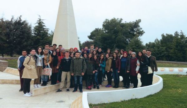 Οι μαθητές πόζαραν χαμογελαστοί στο μνημείο της μάχης του Τσανάκκαλε, το οποίο έχει κατασκευαστεί για να θυμίζει την ήττα των συμμαχικών στρατευμάτων το 1915 από τον τουρκικό στρατό υπό τις οδηγίες του Κεμάλ Ατατούρκ.