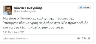 Με ένα tweet σχολίασε ο Αδωνις Γεωργιάδης τη σημερινή παρέμβαση του Γιάννη Πανούση στα Νέα αλλά και την επίθεση της Ραχήλ Μακρή προς αυτόν.