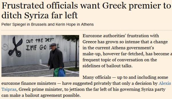Ένα νέο συνασπισμό του ΣΥΡΙΖΑ «με το παραδοσιακό κεντροαριστερό κόμμα της Ελλάδας, το δοκιμαζόμενο ΠΑΣΟΚ, και με Το Ποτάμι» ονειρεύονται στις κορυφές της ευρωζώνης, ζητώντας από τον Αλέξη Τσίπρα «να ξεφορτωθεί το ακροαριστερό κομμάτι» στο κόμμα του, ώστε «να επιτραπεί η επίτευξη μιας συμφωνίας». Αυτό αναφέρει ρεπορτάζ των Peter Spiegel στις Βρυξέλλες και Kerin Hope στην Αθήνα που δημοσιεύει η ηλεκτρονική σελίδα των Financial Times (FT). «O εκνευρισμός των ευρωπαϊκών αρχών με την Ελλάδα έχει διογκωθεί τόσο που μια αλλαγή στη σύνθεση της ελληνικής κυβέρνησης, όσο δύσκολη κι αν είναι, συζητείται ανοιχτά πλέον στα περιθώρια των διαπραγματεύσεων. Πολλοί αξιωματούχοι, συμπεριλαμβανομένων και υπουργών Οικονομικών της ζώνης του ευρώ, υποστηρίζουν σε ιδιωτικές συζητήσεις πως μόνο μια απόφαση του Αλέξη Τσίπρα να ξεφορτωθεί το ακροαριστερό κομμάτι του ΣΥΡΙΖΑ μπορεί να επιτρέψει την επίτευξη μιας συμφωνίας», αναφέρει το ρεπορτάζ των FT.