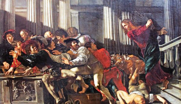 «Και εγγύς ην το πάσχα των Ιουδαίων, και ανέβη εις Ιεροσόλυμα ο Ιησούς. Και εύρεν εν τω ιερώ τους πωλούντας βόας και πρόβατα και περιστεράς και τους κερματιστάς καθημένους. Και ποιήσας φραγγέλιον εκ σχοινίων πάντας εξέβαλεν εκ του ιερού, τα τε πρόβατα και τους βόας, και των κολλυβιστών εξέχεε το κέρμα και τας τραπέζας ανέστρεψε, και τοις τας περιστεράς πωλούσιν είπεν· άρατε ταύτα εντεύθεν· μη ποιείτε τον οίκον του πατρός μου οίκον εμπορίου. Εμνήσθησαν δε οι μαθηταί αυτού ότι γεγραμμένον εστίν, ο ζήλος του οίκου σου καταφάγεταί με».