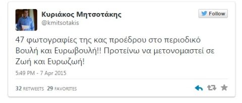 “47 φωτογραφίες της κας προέδρου στο περιοδικό Βουλή και Ευρωβουλή!! Προτείνω να μετονομαστεί σε Ζωή και Ευρωζωή!” έγραψε στο Twitter o Κοινοβουλευτικός Εκπρόσωπος της ΝΔ.